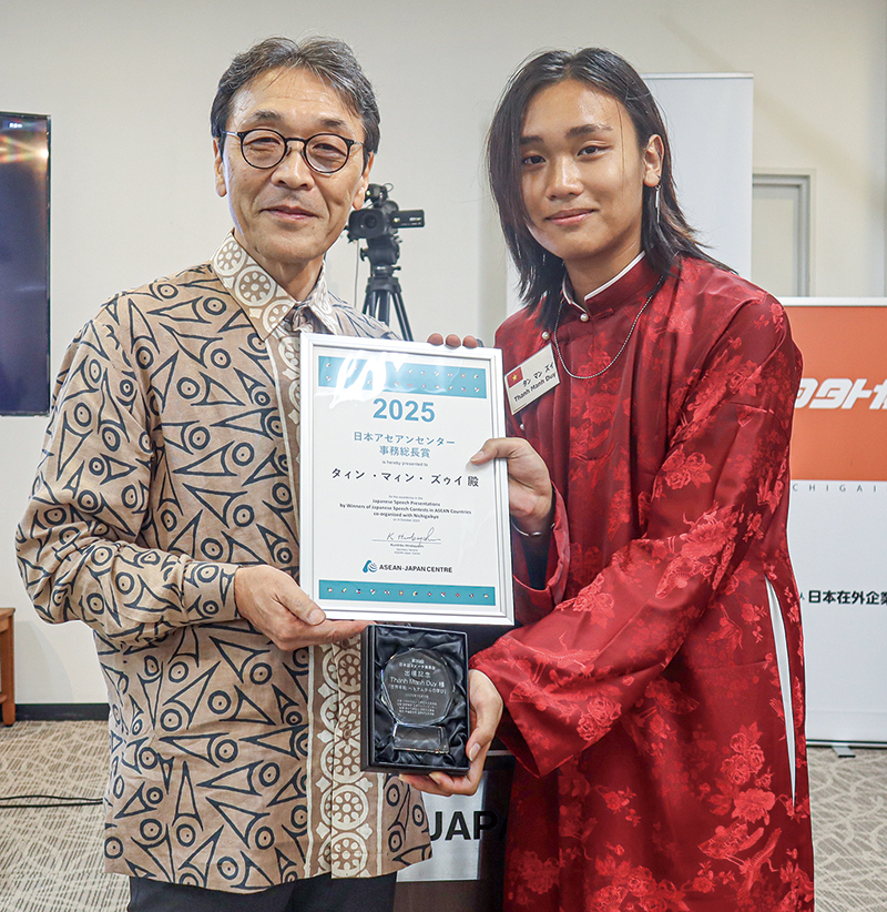 その後、主催である日外協会長賞と日本アセアンセンター事務総長賞の発表があった。これはスピーチの優劣ではなく、いかに主催団体の趣意に近い内容かという基準によって選ばれ、日外協会長賞はシンガポールのン ジャーシュアンさん(「最初の一歩を踏み出すために」)が、日本アセアンセンター事務総長賞はベトナムのタィン マィン ズゥイさん(「世界平和:ベトナムからの学び」)がそれぞれ受賞した。